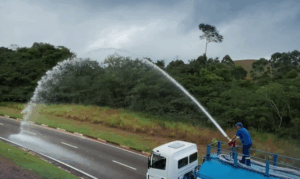 O rabo de pavão, também chamado de aspersor traseiro, é um implemento voltado para dispersão de água em faixa, muito usado na umidificação de vias, acessos e áreas com solo exposto.
