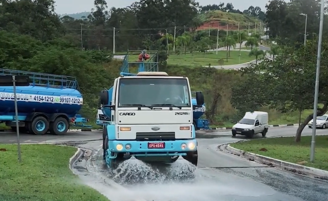 Um caminhão-pipa tem suas particularidades. Por carregar líquido, há risco dinâmico associado ao movimento da água no tanque, que pode deslocar o centro de gravidade do veículo e exigir técnica e prudência na operação.